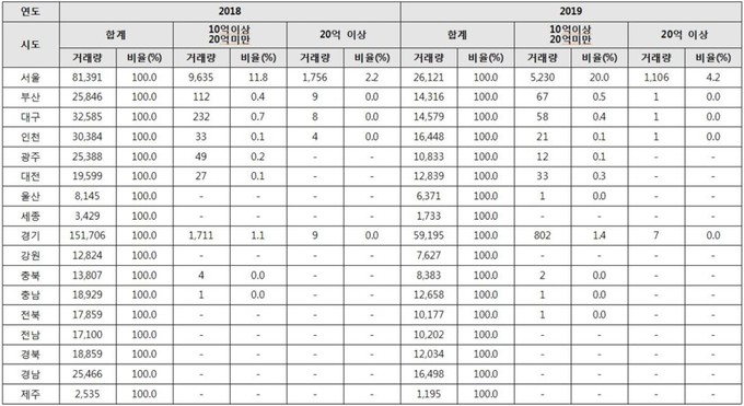 서울 외 지역에서는 △ 부산(1가구) △ 대구(1가구) △ 인천(1가구) △ 경기(7가구)에서 단 10가구의 실거래가만 20억 원을 넘었다.