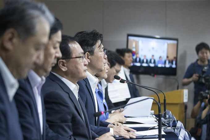 ▲ 성윤모 산업통상자원부 장관 등 관계부처 관계자들이 5일 오전 서울 종로구 정부서울청사에서 대외의존형 산업구조 탈피를 위한 소재·부품·장비 경쟁력 강화 대책을 발표하고 있다. [정병혁 기자]