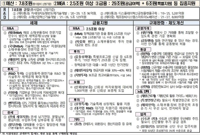 80대 품목에 대해서는 7년간 7조8000억 원 규모의 대규모 R&D 재원을 집중 투자하면서 인수합병(M&A), 해외기술 도입, 투자유치 활성화 등의 기술획득 방안도 다양화한다. 아울러 예비타당성조사(예타) 면제, 예산 증액, 세액 공제 등을 통해 핵심기술을 적기에 확보할 수 있도록 지원한다.