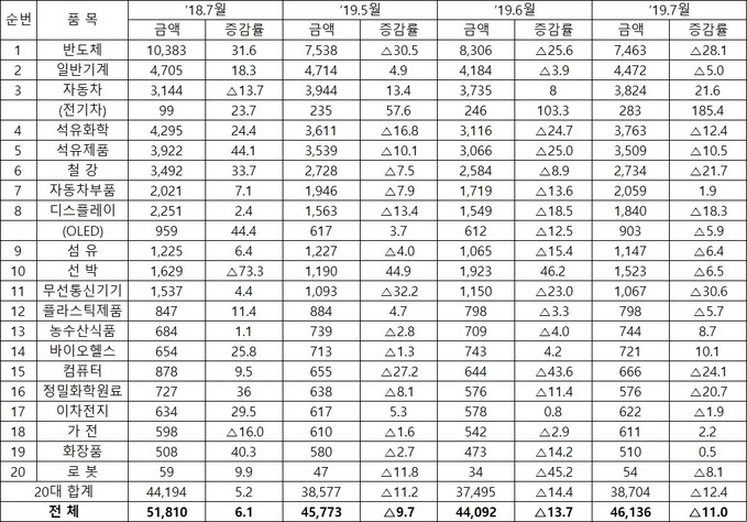 ▲ 20대 주요 수출 품목 규모 및 증감률(단위: 백만 달러, %). [산업부 제공]