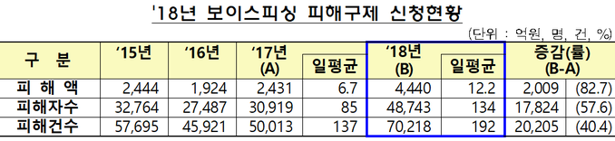 금융감독원은 지난해 보이스피싱 피해액이 4440억원을 기록했다고 28일 밝혔다. 이는 2017년 피해액인 2431억원보다 82.7%(2009억원) 급증한 수치로 역대 최고치다.