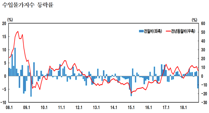 한국은행이 13일 발표한 '2018년 11월 수출입물가지수'를 보면 지난달 수입물가지수(2010=100)는 87.96으로 한 달 전보다 4.6% 하락했다. 수입물가가 떨어진 것은 8월(-0.2%) 이후 처음이며, 이번 낙폭은 2015년 1월(-7.5%) 이후 최대였다.