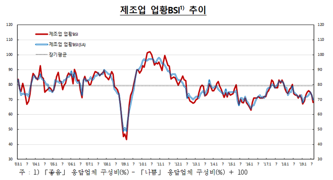 기업형태별로는 수출기업(80)과 내수기업(62) 모두 4포인트씩 빠졌다. 내수기업의 업황 BSI는 2009년 3월(56) 이후 10년 5개월 만에 가장 낮은 수준으로 떨어졌다.