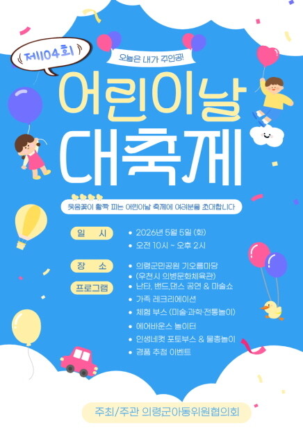 경남 의령군은 다음달 5일 군민공원 기오름마당에서 '제104회 어린이날 대축제' 행사를 개최한다고 밝혔다.
