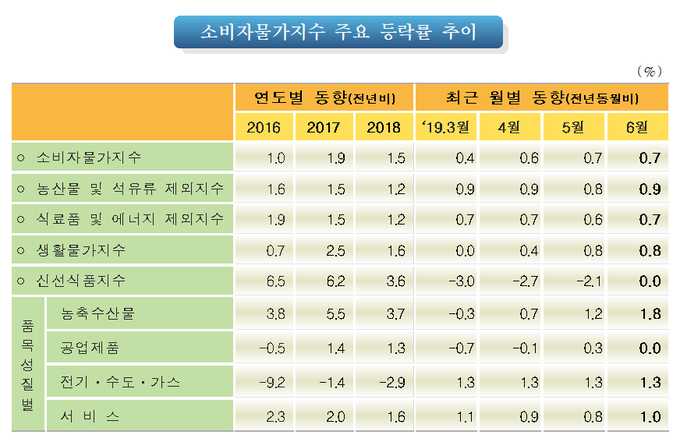 1∼6월 전년 대비 누계 상승률은 0.6%로, 2015년 1∼6월(0.6%) 이후 가장 낮은 수준이다.