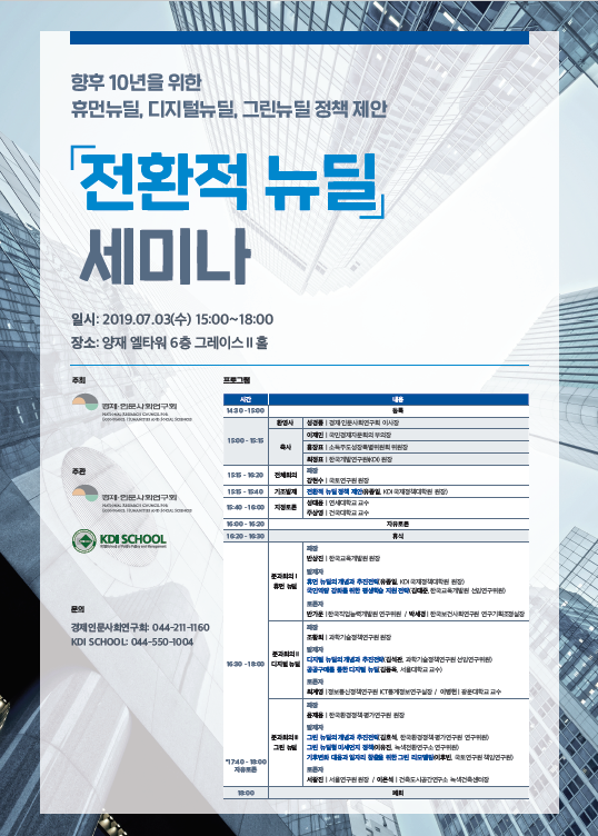 한국개발연구원(KDI) 국제정책대학원과 경제·인문사회연구회는 3일 서울 엘타워에서 열린 '전환적 뉴딜 세미나'를 통해 이러한 내용을 중심으로 하는 정책 패키지를 제안한다고 밝혔다.