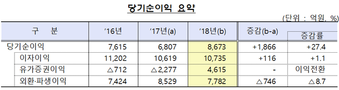 유가증권 부문은 금리 하락으로 매매(885억 원)와 평가(3730억 원) 모두 흑자 전환해 4615억 원의 순이익을 냈다.