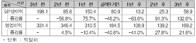 당기순이익과 영업이익의 경우 공격한 기간에 각각 46.2%, 40.6%, 다음 해엔 83.6%, 41.0% 감소해 큰 타격을 입은 것으로 조사됐다.