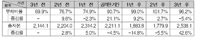 부채비율은 행동주의 펀드의 공격 전까지 70% 수준을 유지하다 공격 기간에 90.7%로 상승해 전년 대비 21.1% 늘었고, 자본은 자기주식의 매입 등에 따라 공격 기간에 4.5%, 1년 후 14.8%, 2년 후 5.5%씩 감소했다.