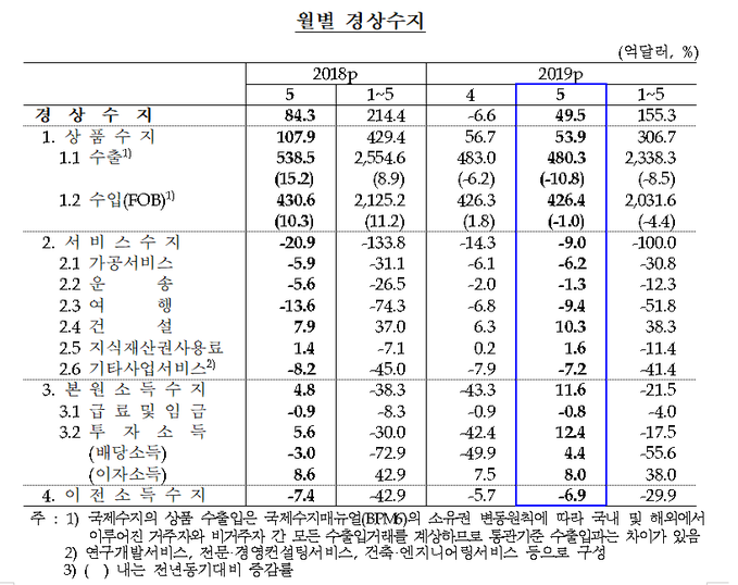한국은행이 4일 발표한 '2019년 5월 국제수지(잠정)'에 따르면 5월 경상수지는 49억5000만 달러 흑자로 집계됐다. 앞서 4월 경상수지는 6억6000만달러 적자를 나타내 2012년 4월 이후 7년 만에 처음으로 적자를 기록한 바 있다.