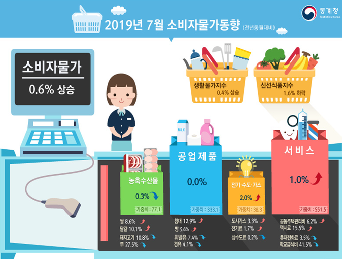 1일 통계청이 발표한 '소비자물가동향'에 따르면 지난 7월 소비자물가지수는 104.56(2015년=100)으로 1년 전 대비 0.6% 올랐다. 이는 2015년 2~11월 10개월간 0%대를 유지한 이후 가장 긴 기간이다.