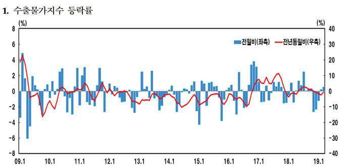 한국은행이 12일 발표한 '2019년 3월 수출입물가지수'를 보면 지난달 수출물가지수(2010년=100·원화 기준)는 83.36으로 한 달 전보다 0.5% 올랐다.