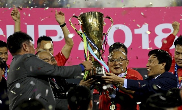 ▲ 지난 15일(현지시각) 베트남 하노이 마이딘 스타디움에서 열린 2018 아세안축구연맹(AFF) 스즈키컵 결승전 최종 2차전에서 베트남을 우승으로 이끈 박항서 감독이 우승컵을 들어올리며 기쁨을 선수들과 나누고 있다. 베트남은 이 경기에서 전반 6분 안둑의 결승 골로 1-0으로 말레이시아를 눌러 10년만에 우승을 차지했다. [뉴시스]