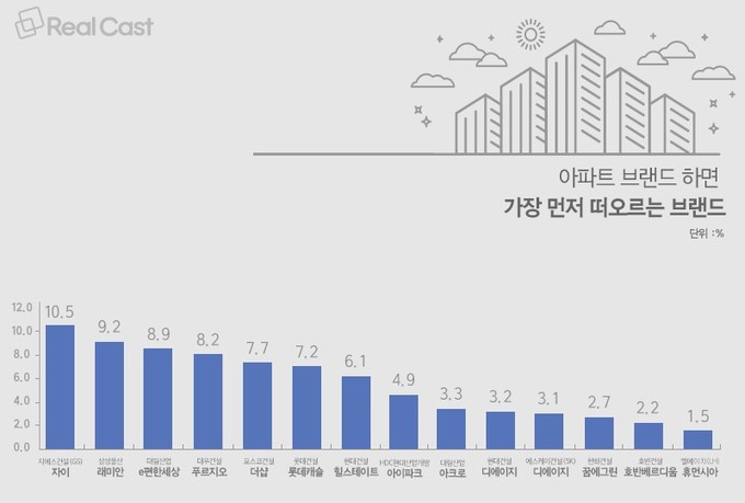 자이는 '아파트 브랜드하면 가장 먼저 떠오르는 브랜드' 문항에서 응답률 10.5%(복수응답)으로 1위를 차지했다.