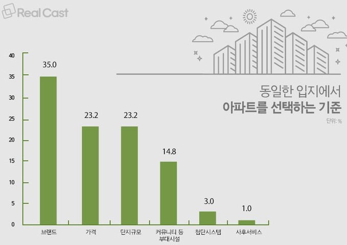 한편 동일 입지에서 아파트를 선택하는 기준에 대한 질문에 응답자 35%가 '브랜드'라고 답했다. '가격'과 '단지규모'를 꼽은 응답자는 각각 23.2%로 동일했다.