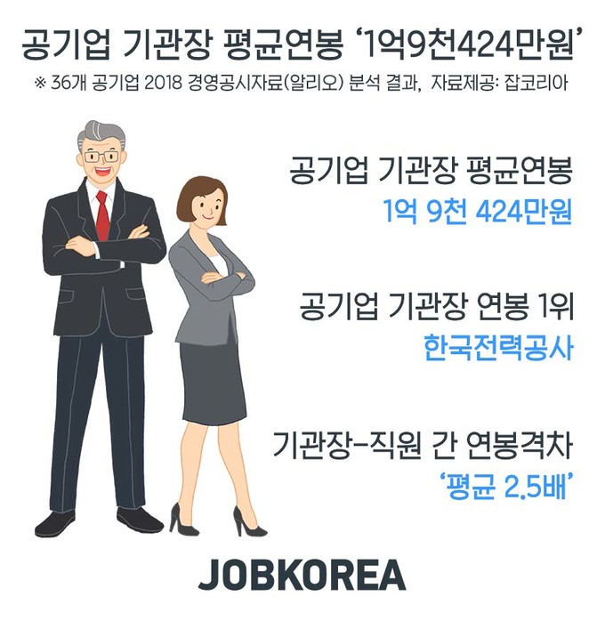 19일 취업포털 잡코리아에 따르면 공공기관 경영정보 시스템 '알리오'에 공시된 36개 공기업의 경영공시 자료를 분석한 결과 이들 공기업의 상임 대표가 지난해 받은 보수는 평균 1억9424만 원이었다.