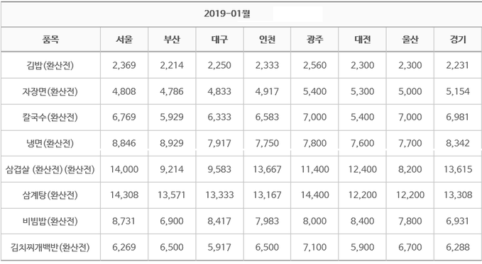 21일 한국소비자원 가격정보 종합포털 '참가격'에 따르면 지난 1월 서울 지역에서 김밥과 냉면, 비빔밥 가격은 1년 전인 2018년 1월보다 8%가량 상승했다.
