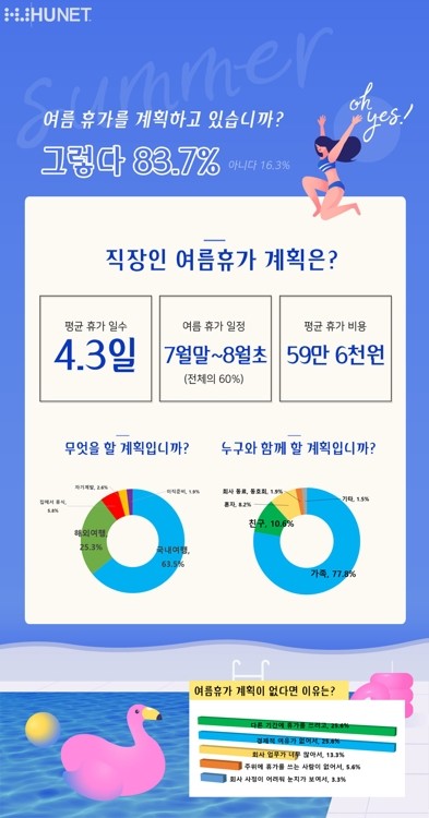 평생교육 대표기업 휴넷은 12일 직장인 1천106명을 대상으로 설문 조사한 결과 응답자의 83.7%가 올해 여름 휴가를 계획하고 있다고 밝혔다.
