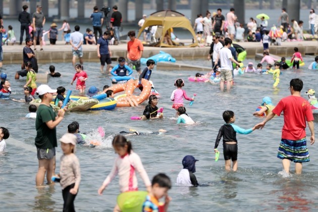 ▲ 전국 대부분 지역에 폭염특보가 내려진 24일 서울 여의도 물빛광장이 물놀이를 즐기는 시민들로 붐비고