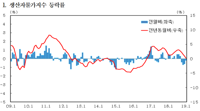 한국은행이 22일 발표한 '2019년 1월 생산자물가지수'를 보면 지난달 생산자물가지수는 103.75(2010년=100 기준)로 한 달 전보다 0.2% 내렸다.