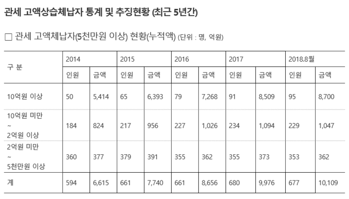 2014년 6615억원(594명)이었던 관세 고액 상습 체납금은 2015년 7740억원(661명), 2016년 8656억원(661명), 2017년 9976억원(680명)으로 증가해 왔다.