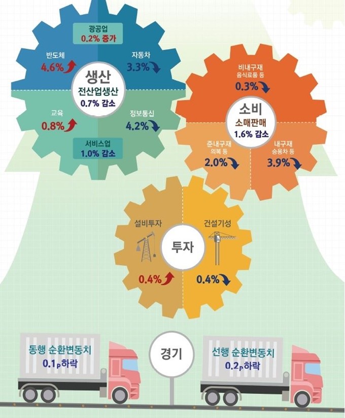 지난달 생산과 소비가 동반 감소했고 크게 줄었던 투자는 한 달 만에 반등했다. 현재와 미래의 경기를 보여주는 경기종합지표도 하락세로 전환됐다.