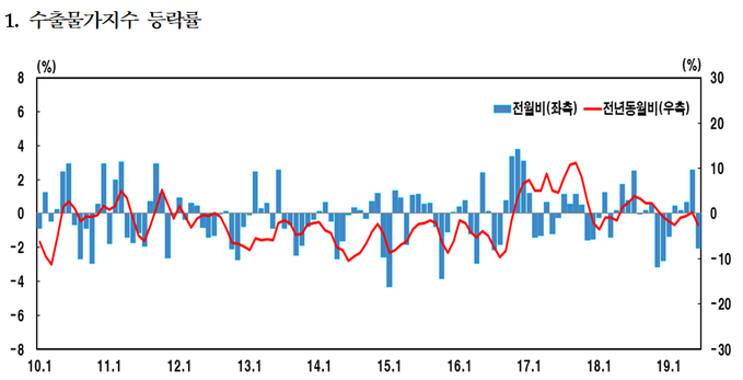 수출 품목별로 보면 공산품에서 경유(-9.9%)와 휘발유(-12.1), 제트유(-4.9%) 등 석탄 및 석유제품이 8.3% 하락하며 큰 낙폭을 보였다. 컴퓨터, 전자 및 광학기기 가격도 2.0% 내려갔다. 그중 D램 반도체 수출 가격은 5.3% 하락해 지난해 8월부터 11개월 연속 내림세를 지속했다.