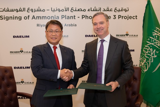 대림산업은 지난 22일(현지시간) 사우디 국영광물공사 '마덴' 본사에서 8억9200만달러(약 1조원)에 달하는 '뉴 암모니아' 프로젝트 계약을 체결했다고 23일 밝혔다.