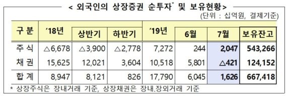 12일 금융감독원에 따르면 7월 중 외국인은 국내 상장주식을 2조470억 원어치 순매수한 반면 상장채권에서 4210억 원을 순회수하면서 총 1조6260억 원이 순투자됐다. 주식은 6월 이후 순매수가 유지되고 있으나, 채권은 5개월만에 순회수로 전환됐다.