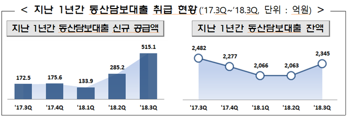 금융위는 올해 3분기 동산담보대출 취급 잔액을 2345억원으로 집계했다. 이는 직전분기 2063억원 대비 282억원 증가한 금액으로 은행들이 3분기에 515억원 상당의 동산담보대출을 취급한 결과다.