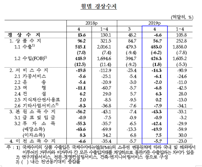 한국은행이 5일 발표한 '2019년 4월 국제수지(잠정)'에 따르면 4월 경상수지는 6억6000만 달러 적자로 집계됐다.