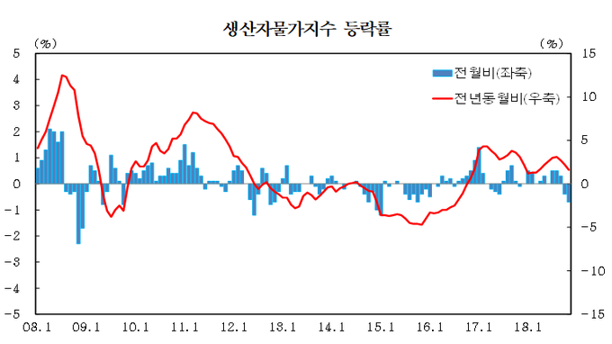 생산자물가는 10월(-0.4%)에 이어 두 달 연속 하락세를 기록했다. 생산자물가가 2개월 이상으로 연속해서 하락한 것은 작년 4∼6월 이후 처음이다.