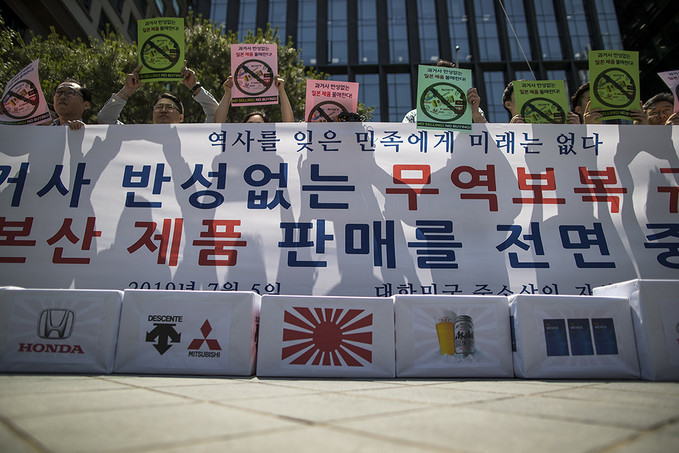 ▲ 한국중소상인자영업자총연합회 관계자들이 5일 오전 서울 종로구 옛 주한 일본대사관 앞에서 일본 제품 불매운동 선언 기자회견을 열고 피켓시위를 하고 있다.. [정병혁 기자]