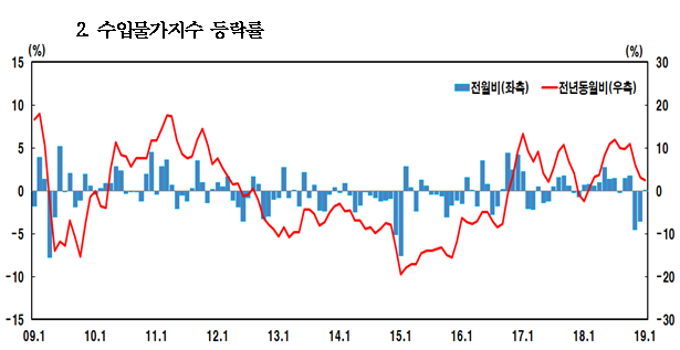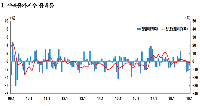 한국은행이 19일 발표한 '2019년 1월 수출입물가지수'를 보면 1월 수출물가지수(2010=100·원화 기준)는 82.95로 한 달 전보다 1.0% 하락했다.