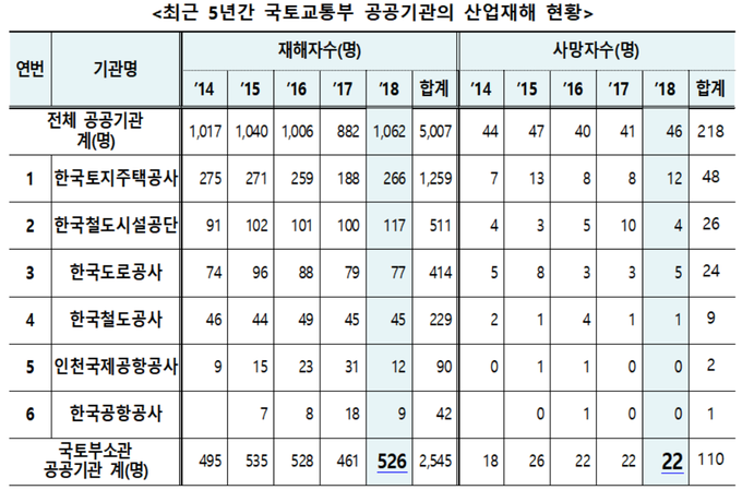 아울러 2014년 이후 국토부 공공기관의 산업재해자수는 2545명, 사망자수는 110명으로 전체 조사 대상 공공기관의 산업재해에 절반을 차지했다. 국토부 공공기관은 LH, 한국철도시설공단, 한국도로공사, 한국철도공사, 인천국제공항공사, 한국공항공사 등이다.