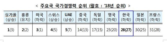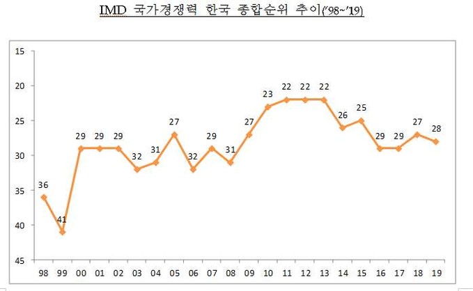 작년 두 계단 상승했던 한국의 스위스 국제경영개발대학원(IMD) 국가경쟁력 평가 순위가 올해는 28위로 한 계단 하락했다. 수출, 투자, 취업자 등 주요 지표 증가율이 둔화하며 경제성과 분야는 7계단 하락했다. 기업 효율성은 9계단 상승했다.