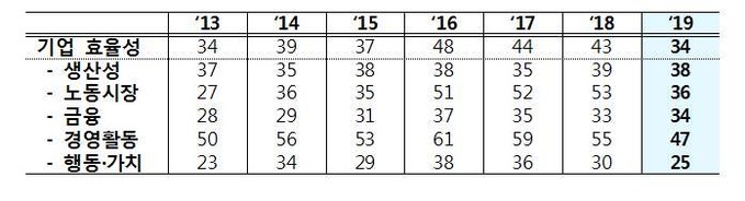 그 동안 상대적으로 낮았던 기업 효율성 분야 순위는 올해 34위로 9계단 올라섰다. 근로 동기부여(41위) 항목이 전년보다 개선되며 2014년 이후 최고 순위인 36위를 기록했다. 경영활동(47위), 행동·가치(25위) 부문도 순위가 작년보다 올랐다.