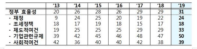 국내총생산(GDP) 규모(12위), GDP 대비 투자 규모(4위), 상품 수출 규모(6위), 교역조건(6위), 장기실업률(3위) 항목은 양호했다. 그러나 GDP·수출·투자·취업자 증가율이 둔화하면서 국내경제(16위), 국제무역(45위), 고용(10위) 부문에서 전년보다 순위가 밀렸다. 정부 효율성 분야는 31위로 두 계단 떨어졌다.