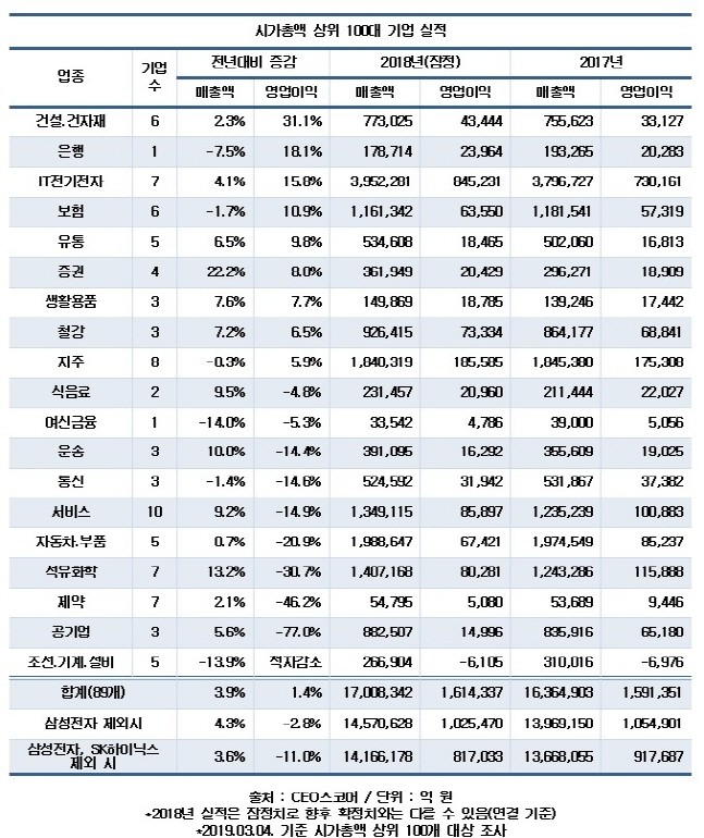 10일 기업 경영성과 평가사이트 CEO스코어에 따르면 시총 상위 100대 기업 중 2018년 잠정실적(연결기준)을 발표한 89곳을 조사한 결과, 매출과 영업이익은 각각 1700조8342억원과 161조4337억원으로 집계됐다.