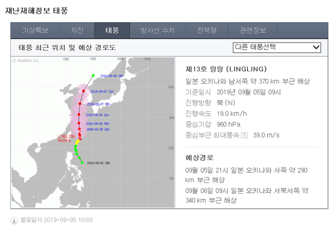 ▲ 제13호 태풍 '링링'이 주말께 우리나라를 관통할 것으로 예보되자 5일 손해보험사들이 비상체제에 돌입했다. [네이버 캡처]