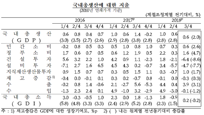 투자 중에서 건설투자 증가율은 건물과 토목건설이 모두 줄며 지난 2분기 -2.1%에서 3분기 -6.4%로 내려앉았다. 이는 지난 1998년 2분기(-6.5%) 이후 약 20년 만에 가장 낮은 수준이다.