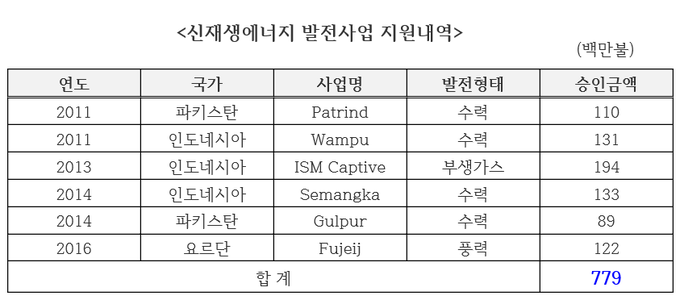 반면 신재생에너지 발전사업에 대한 지원은 답보 상태에 있는 것으로 드러났다. 2011년 시작해 현재까지 7억7900만 달러를 투자했지만, 2017년 이후 신재생에너지 발전사업에 대한 지원은 없는 상황이다.