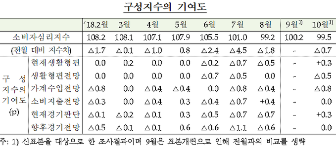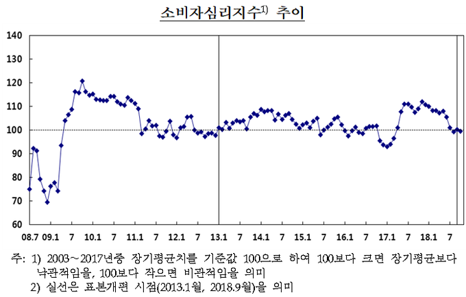 26일 한국은행이 발표한 '2018년 10월 소비자 동향조사 결과'를 보면 이달 소비자심리지수(CCSI)는 99.5로 한 달 전보다 0.7포인트 하락했다. 지수가 100이하로 떨어진 것은 지난 8월 이후 두 달 만이다.