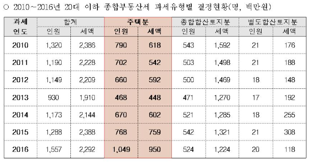 12일 국회 국토교통위원회 소속 김상훈 자유한국당 의원이 국토교통부와 국세청으로부터 제출받은 '20대 이하 종합부동산세 결정 현황'에 따르면 과세연도 2016년 기준 주택보유로 종부세를 낸 20대 이하는 1049명으로 총 9억5000만원을 냈다. 이는 2010년 이후 가장 큰 규모다.