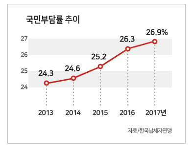 22일 한국납세자연맹(회장 김선택)이 정보공개청구 등을 통해 분석한 자료에 따르면 2017년 국민부담률은 26.9%로 전년(26.3%)보다 0.6%포인트 증가했다.