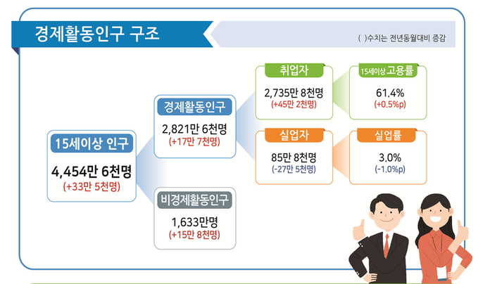 통계청은 "그 동안 감소 폭이 컸던 제조업과 도·소매업, 40대에서 감소 폭이 축소돼 취업자 수가 증가하는 데 기여했다"고 설명했다.