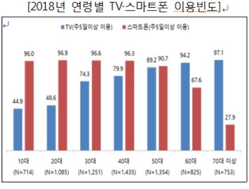 중년층인 50대의 주 5일 이상 스마트폰 이용빈도가 90.7%(중복응답)로 TV(89.2%)를 처음으로 앞질렀다.