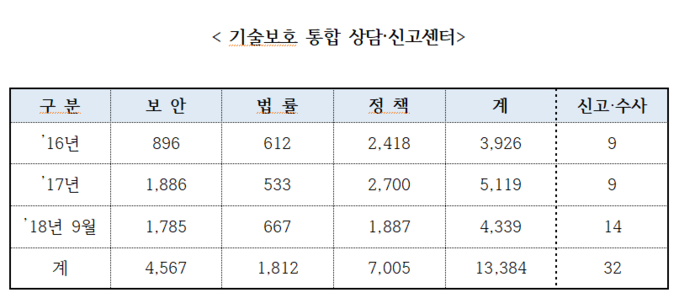 최근 3년간 중소벤처기업부 '기술 보호 통합 상담·신고 센터'에 접수된 상담건수가 1만3000건이 넘어 기술유출방지 시스템을 마련해야 한다는 지적이 나오고 있다.