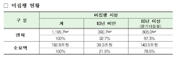 이들 미집행시설을 전부 집행하는데 소요될 예산 규모는 182조8000억원에 이른다. 특히 10년 이상 장기미집행시설을 집행하는 데 143조5000억원이 들어갈 것으로 분석된다.