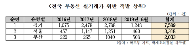 2일 국토교통위원회 소속 더불어민주당 박재호 의원(부산 남구을)이 국토교통부로부터 제출받은 '전국 부동산 실거래가 위반 현황' 자료에 따르면 부동산 실거래가 위반은 2016년 3884건, 2017년 7263건, 2018년 9596건, 2019년 6월까지 3870건으로 총 2만4613건으로 집계됐다. 위반에 따른 과태료는 1118억 원이었다.